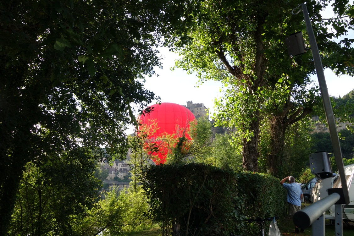 Another day, long after sight-seeing was over, we leapt to our feet to chase a hot air balloon that looked set to (gently) crash land in our camping ground at Chateau Beynac – only to see it lightly kiss the Dordogne River just metres away and take off into the twilight toward the castle towering above.